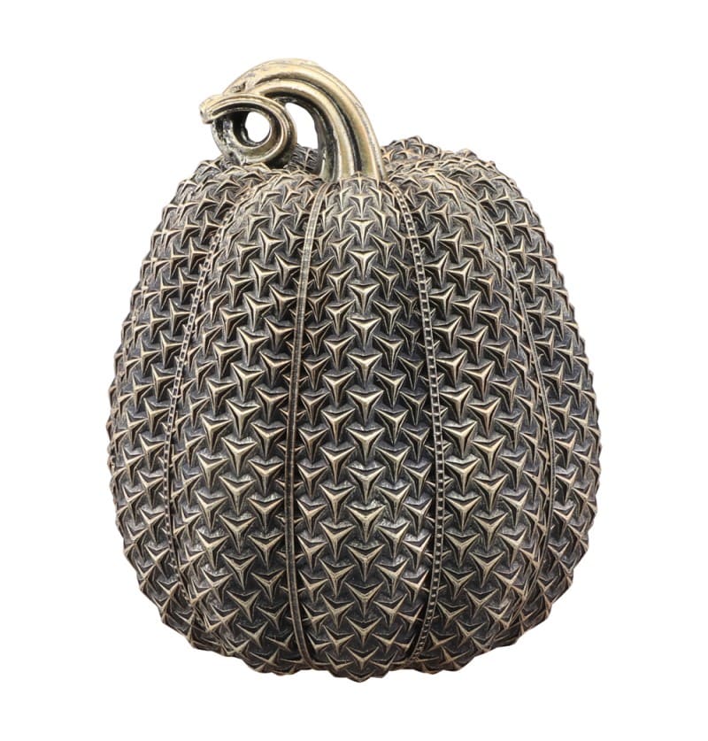 La calabaza decorativa textura bronce combina estilo y detalle en una pieza única. Su acabado metálico y diseño realista la convierten en el complemento ideal para mesas, estanterías o escaparates durante la temporada de otoño y Halloween.