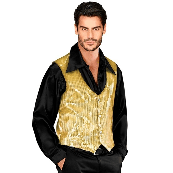 El chaleco lentejuelas dorado es una prenda llamativa y elegante, perfecta para aportar brillo y protagonismo a cualquier disfraz o look de fiesta.