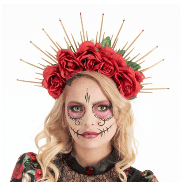 La diadema Corona de Rosas Día de los Muertos es el accesorio perfecto para completar tu look de catrina o celebración mexicana. Adornada con flores rojas intensas, aporta un toque elegante y tradicional a cualquier disfraz o conjunto festivo.