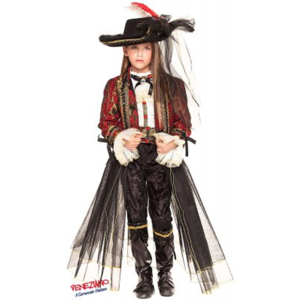 Incluye una camisa de algodón blanca decorada con piedras preciosas, adornos dorados y tul, junto con una original aplicación de cuello de tul con calavera, perfecta para aportar ese toque pirata distintivo. La chaqueta de damasco en tonos burdeos y dorados, con aplicaciones doradas y pedrería roja, añade un aire majestuoso al conjunto.