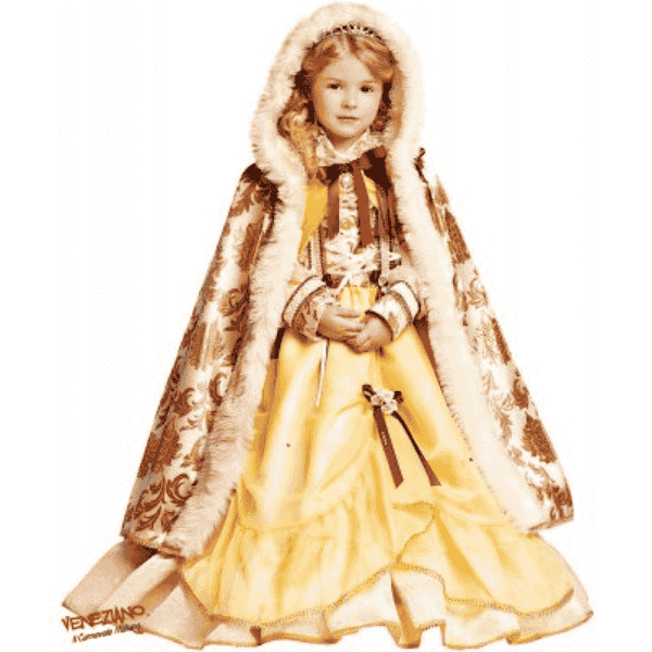 Incluye un manto con capucha elaborado en un lujoso damascado, ribeteado con pelliccia sintética blanca y cerrado al frente con un lazo de raso que aporta un aire regio. El corpiño está adornado con botones joya metálicos y aplicaciones de strass, mientras que la falda se completa con una sottogonna de algodón que aporta volumen y comodidad.