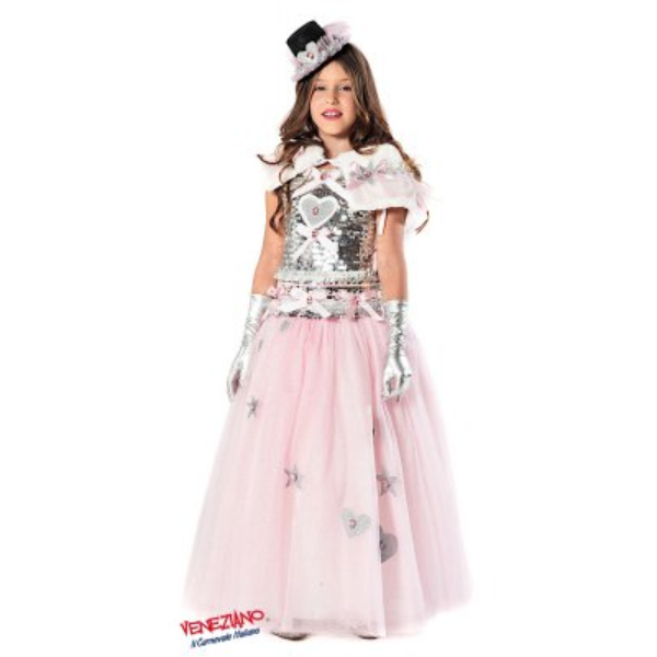 El conjunto incluye un vestido con cuerpo de satén rosa, cubierto por lentejuelas plateadas rectangulares, lazos decorativos y piedras preciosas que añaden un brillo deslumbrante. La falda de tul rosa con destellos está adornada con corazones y estrellas plateadas, además de delicadas piedras rosadas que aportan un toque mágico.