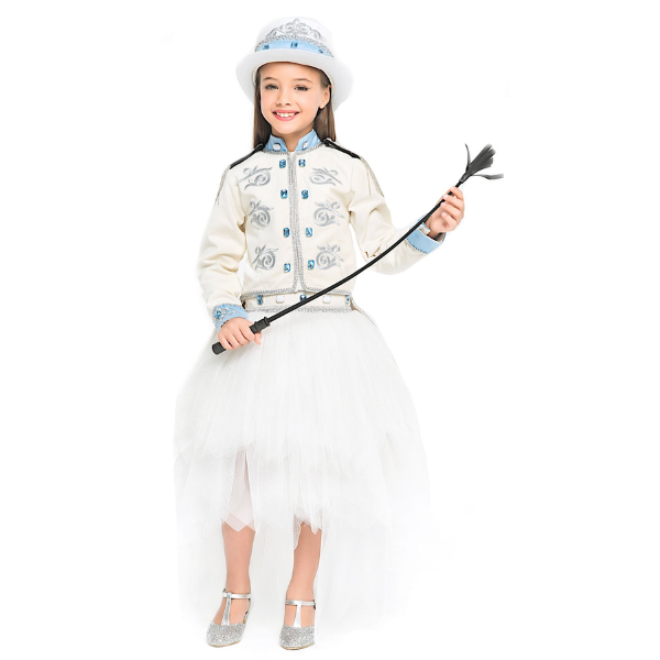 La falda blanca de tul con volantes, complementada con un cinturón de terciopelo y pedrería, crea una silueta elegante y con movimiento. El conjunto se completa con un sombrero de fieltro a juego, decorado con un delicado acabado de tul blanco, y un látigo incluido, perfecto para completar el look de una verdadera jinete de fantasía.