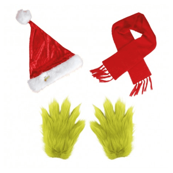 El kit de accesorios The Grinch™ incluye tres piezas imprescindibles para quienes desean lucir el inconfundible estilo del personaje más travieso de la Navidad. Este set contiene gorro, bufanda y guantes, todo perfectamente coordinado para lograr un look festivo, divertido y muy característico.