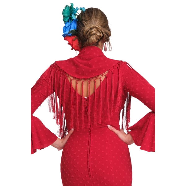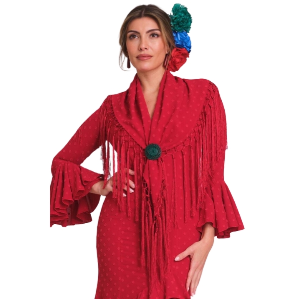 Confeccionado en tejido de calidad, este mantoncillo destaca por su caída fluida y sus acabados cuidados, que permiten lucirlo con gracia sobre los hombros o cruzado al pecho. El diseño bordado evoca la tradición del mantón flamenco, mientras que el tono rojo añade un toque vibrante y muy favorecedor.