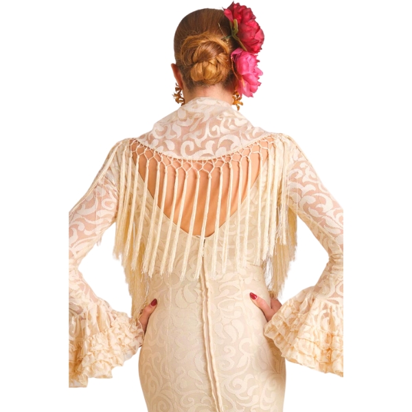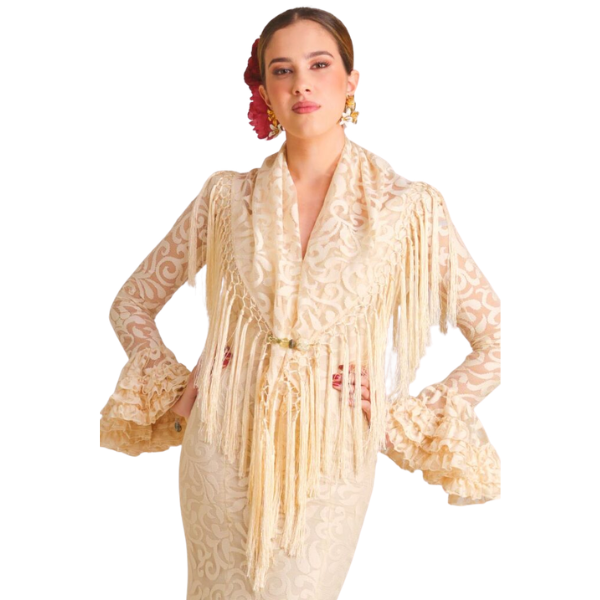 El mantoncillo Mantilla beige es una pieza refinada que aporta luz, equilibrio y elegancia a cualquier traje de flamenca. Su tono beige suave lo convierte en un complemento versátil y fácil de combinar, ideal para estilismos clásicos o actuales.