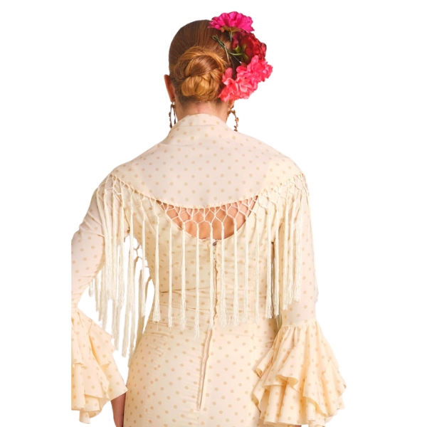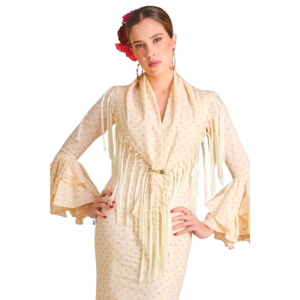 El mantoncillo Marismilla beige es la elección perfecta para quienes buscan un complemento tradicional, favorecedor y fácil de combinar, capaz de elevar cualquier traje flamenco con un toque refinado y distinguido.