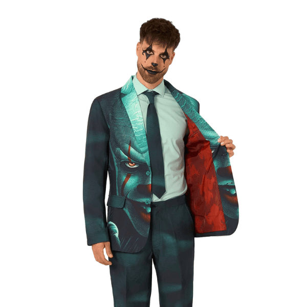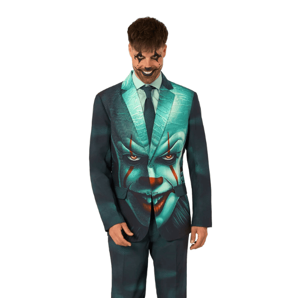 El traje IT™ Pennywise adulto es el atuendo oficial inspirado en el temible payaso de It. Incluye chaqueta, pantalón y corbata con un elegante corte slim fit, ideal para lucir un estilo aterrador y sofisticado en Halloween o fiestas temáticas de terror.